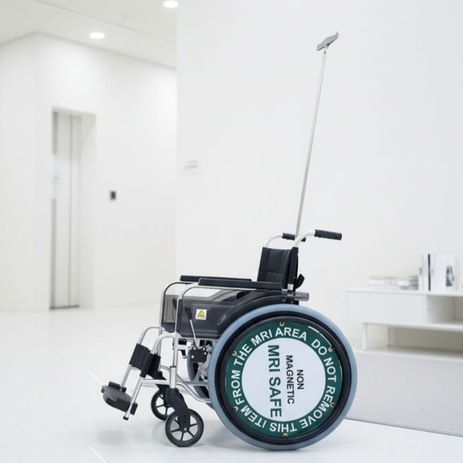 알루미늄 재질의 휠체어로 거동이 불편한 환자를 MRI실까지 안전하게 이동하도록